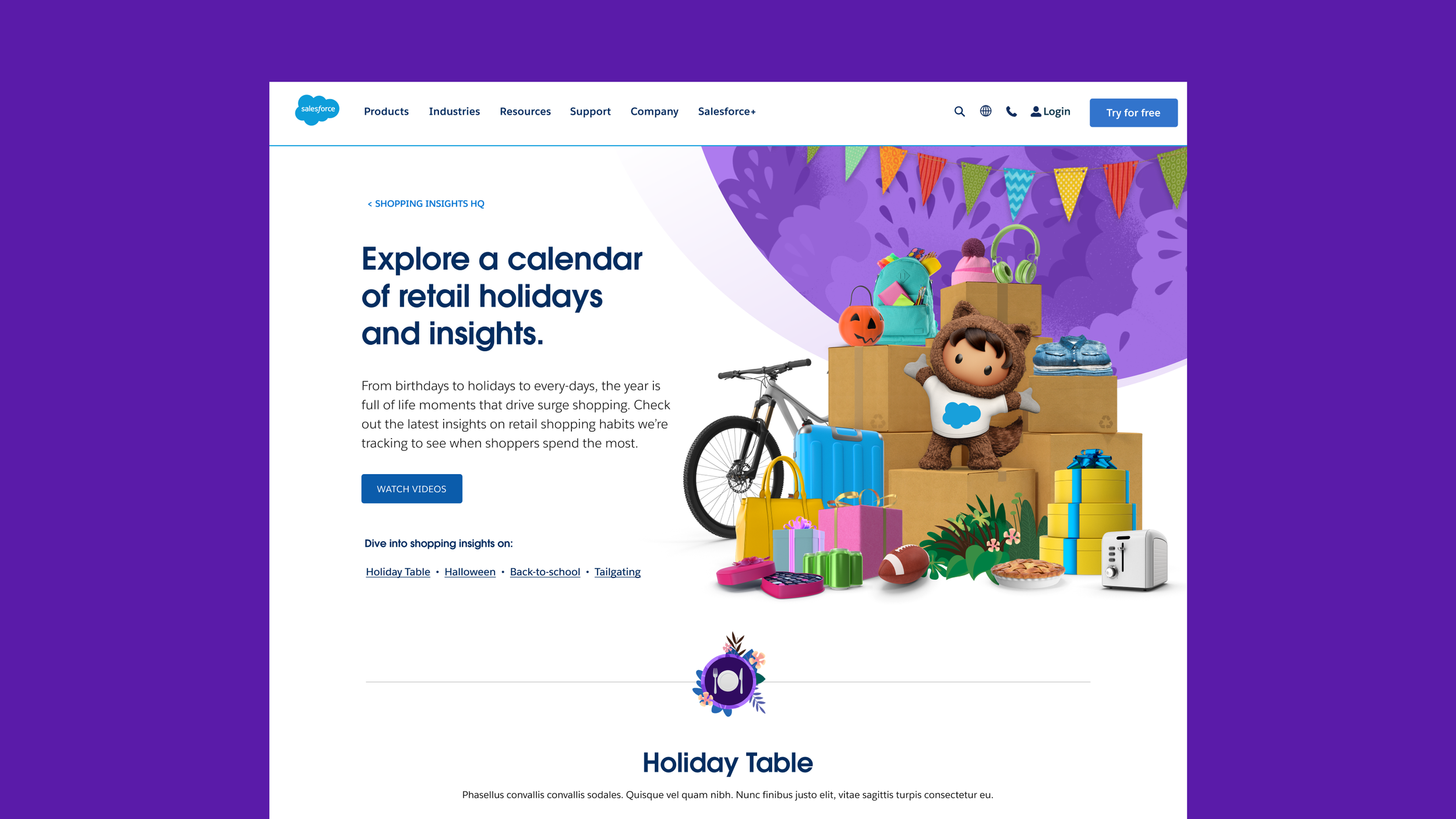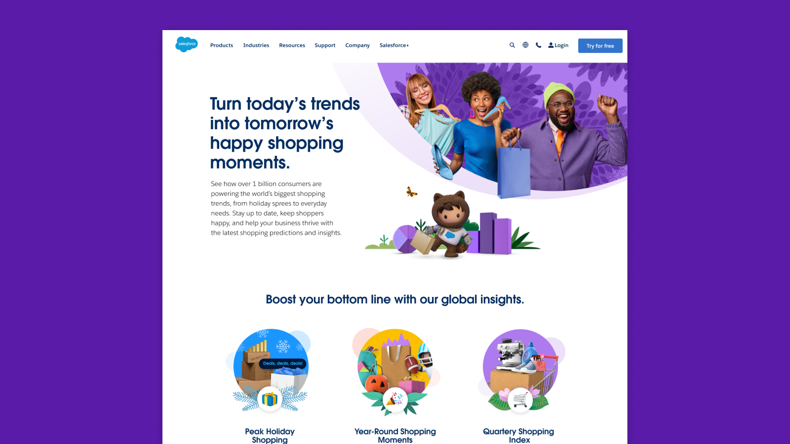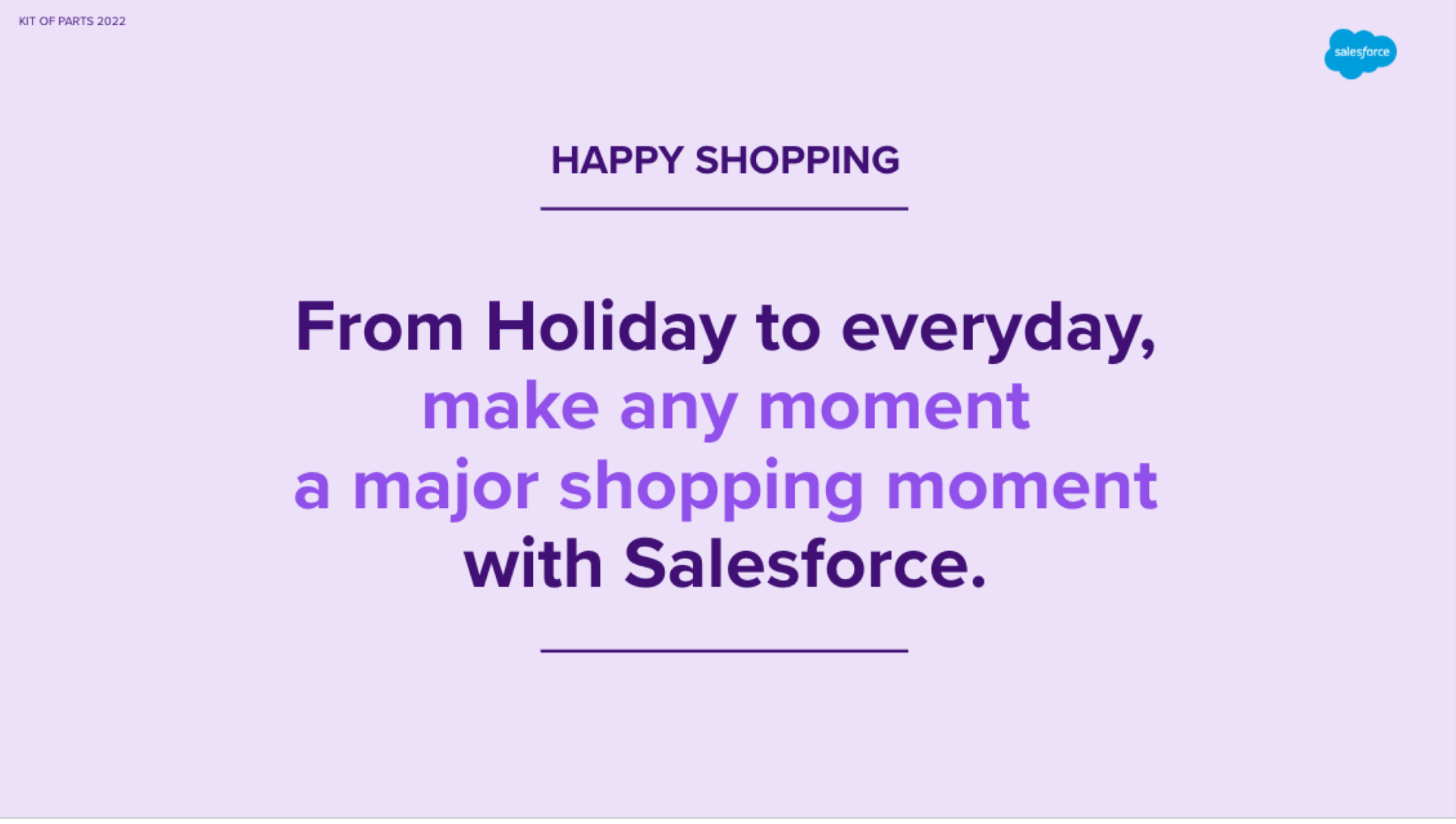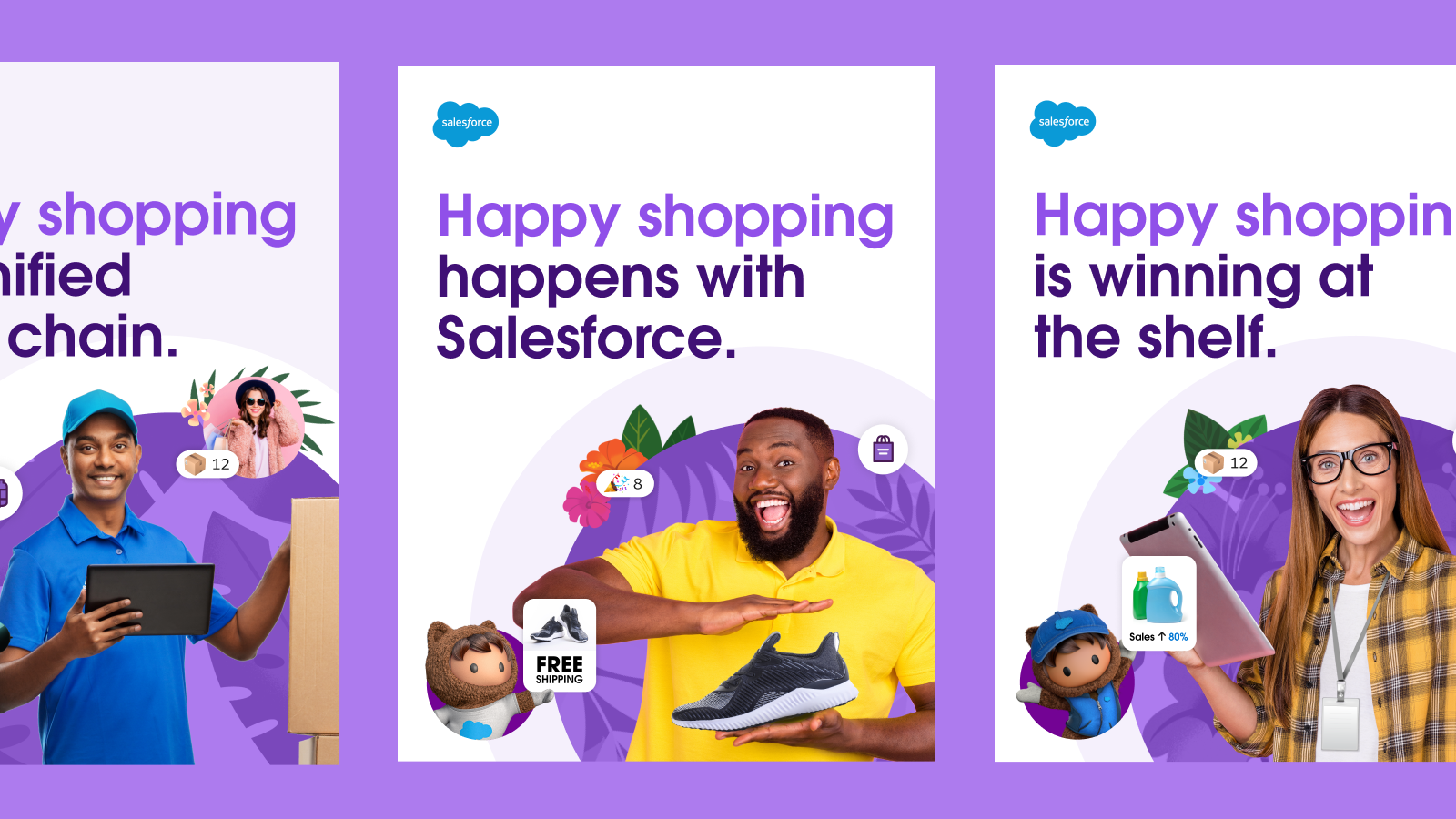 As Creative Lead for Salesforce’s Industry team, I led creative for Retail and Consumer Goods, developing the 2022 franchise campaign Happy Shopping. I owned the core idea, copy and visual direction, and built a scalable kit of parts, including Shopping Insights HQ, with integrated execution across social, blog, and video.