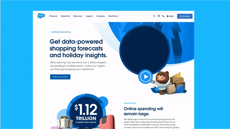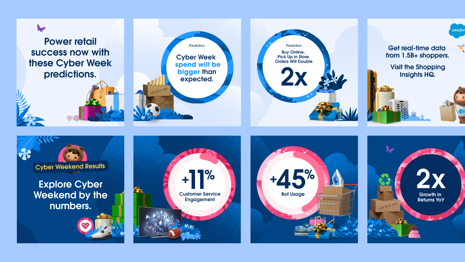 I also led SF Powers the Holidays, one of Salesforce’s largest cross-cloud thought-leadership programs, spotlighting retail shopping trends during the industry’s peak season. The program spanned a full social calendar, website refreshes, and executive-level amplification, including posts from Marc Benioff.